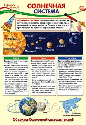 Плакат имеет удобный формат А3, каждый информационный блок выделен отдельным цветом для лучшего запоминания. Материал дает представление о Солнечной системе, рассказывает о планете Земля, ее спутнике Луне, различных созвездиях. Плакат не только наглядно иллюстрирует основные темы учебника, но и дополняет их интересной информацией, которая наверняка будет полезна учащимся.